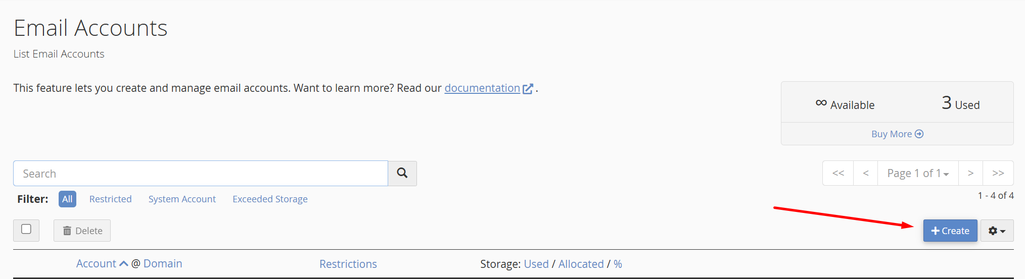 Click on Create to create new email account